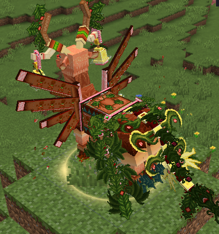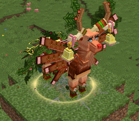 我的世界中的圣诞驼鹿体型高大,身披彩色的装饰,有闪烁的灯光点缀,长着巨大而华丽的鹿角,充满了节日的氛围。它行动优雅,温顺而友好,能给玩家带来欢乐和惊喜